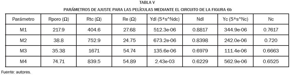 De los parámetros indicados en las Tablas IV y V se puede observar que las resistencias del electrolito tienen el mismo orden de magnitud y son muy similares; las resistencias de poro varían entre unos 35 y 218 ohmios. Se obtuvo para la probeta M4 la mayor resistencia de poro y resistencia a la transferencia de carga. Los máximos valores de las dos pseudocapacitancias se obtuvieron para la probeta M4, para la cual y como ya se mencionó antes, se obtuvo también la velocidad de corrosión más baja; estos resultados podrían estar mostrando que la capa superficial modificada o depositada con el tratamiento es muy delgada, ofrece una protección efectiva al metal, pero que también hay una penetración significativa del electrolito al recubrimiento y hace contacto con el metal.