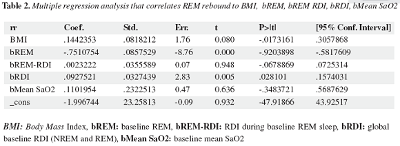179 patients were enrolled (M/F:118/61), with a mean age of 48.6±4 for men, and 51.6±12.9 for women. The mean interval between the bPSG and cPSG was 45 days. The mean REM percentage during the bPSG was 15.55 percent and during cPSG study it was 21.57 percent (Figure 1). We took 6 percent as our differential point as the results became statistically significant at this point (p:0.0001). The major result of this study is that 46 percent of our patient population had greater that 6 percent of RR on the CPAP titration study. We present our data by dividing our patients population with RR smaller that 6 percent and RR greater that 6 percent (Table 1). There was no significant difference by gender in REM rebound (p: 0.47). The correlation matrix of REM rebound showed a significant correlation with body mass index (p 0.080), bPSG stage REM (p 0.0001) and bPSG AHI (p 0.005). The multiple regression model showed that the variables that contribute more to the REM rebound, according to the regression coefficient are: REM sleep during bPSG, bAHI and the body mass index (Table 2, Figure 2). These findings were corroborated with the stepwise regression analysis. Medications did not show a correlation with REM rebound.