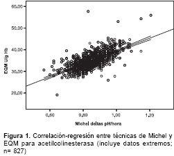Correlación-regresión entre técnicas de Michel y EQM (incluidos datos extremos). En la población total (n= 827) de 827 personas estudiadas, sin tener en cuenta las variaciones existentes entre regiones y entre sexos,que como ya se anotó en realidad existen en el caso de la técnica de Michel, y que posiblemente se deben a que en esta técnica los valores de la enzima no están corregidos según el valor de hemoglobina, el coeficiente r vale 0,666 y R2 es de 44,30; las ecuaciones de regresión lineal de una prueba en otra son: EQM U/g oxihemoglobina = 9,57509 U/g oxihemoglobina + 29,7914 (Michel deltas de pH/hora); Michel deltas de pH/hora = 0,33120 deltas de pH/hora + 0,01487 (EQM U/g oxihemoglobina) (