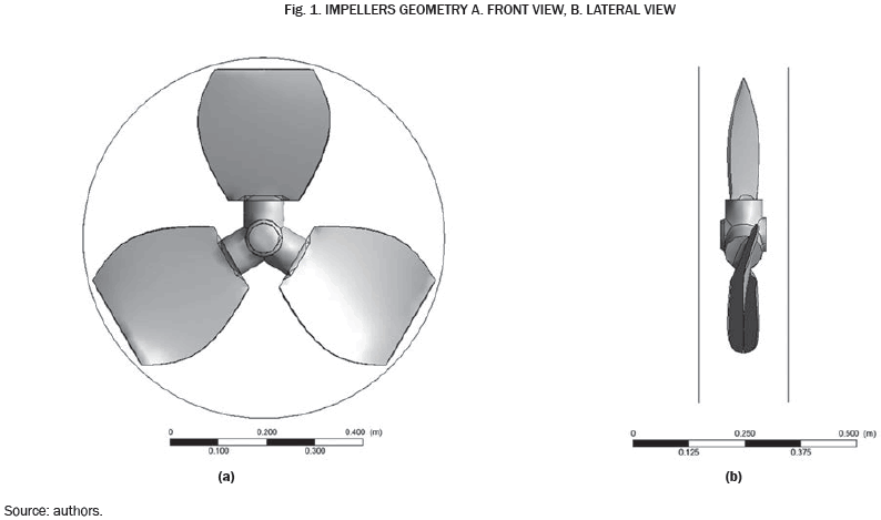 For the computational analysis, the impeller geometry was made in Solid Edge ® (Fig. 1), and was imported to the design modeler of ANSYS ®, where the geometry of the entire tank was completed. To simulate the rotation, the MFR model (Multiple Frames of Reference) was used, it was determined a cylindrical volume that would rotate at the angular velocity of the actual impeller, while in the model, it is at rest as well as the rest of the tank. The agitators were placed at 0.6 m from the base of the tank, it was simulated with the maximum filled level, 7.7 m, and an area of 0.2 m of air left at the top to represent the floating roof. The results presented in this work with 90° and 45° of mounting angle configurations were obtained after 30 minutes of mixing.