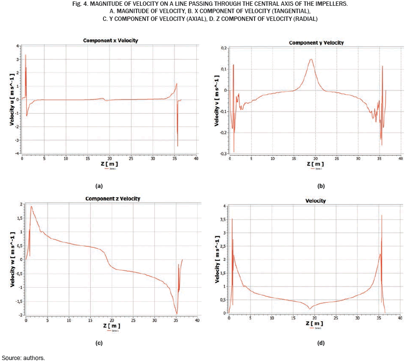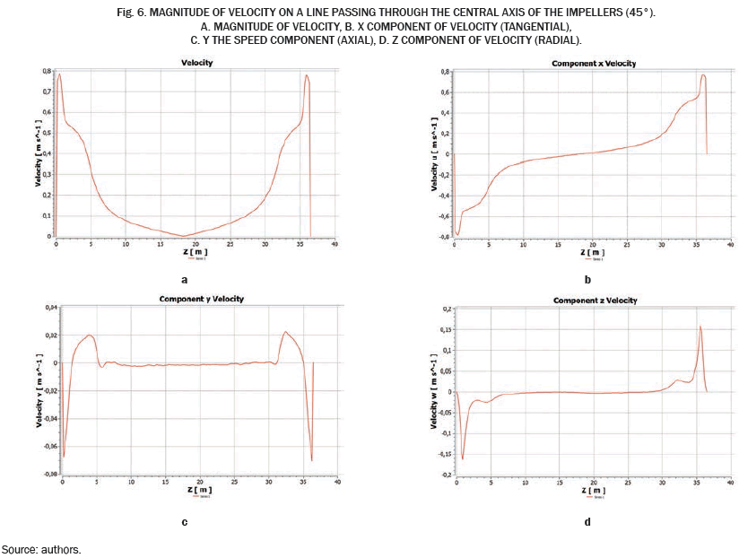 Figure 4b represents the tangential velocity component (x-axis) along the line through the two agitators. It has a value of almost zero at all points of the line, except in the vicinity of the agitators, and at the point where the two opposite flows meet. In Fig. 4c axial velocity component (y-axis) has values close to zero throughout the trajectory, except in the center of the tank, where has increased due to the impact of the meeting of the observed two flows. The radial component is shown in Fig. 4d, showing a similar behavior to the magnitude of the axial velocity, presenting a decrease as it approaches the center of the tank where the velocity has a change of direction and the radial component becomes zero. This component is dominant in this configuration.