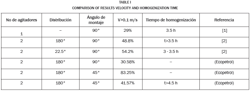 En este artículo se presenta el estudio de la distribución del flujo en un tanque de almacenamiento de crudo de 36.5 m de diámetro. El tanque está equipado con dos agitadores mecánicos de entrada lateral ubicados a 90° y 45° de ángulo de montaje. Se emplea la dinámica computacional de fluidos (CFD) para simular las condiciones del tanque a 7.7 m de altura de llenado. Adicionalmente, se realiza el análisis del tiempo de homogenización de dos crudos de diferentes propiedades para el caso de los agitadores a 45°. Se emplea el modelo de dos fases (Volume of fluid, VOF) para el proceso de mezclado, la rotación de los agitadores se simula con múltiples marcos de referencia (MFR) y se resuelve el fenómeno utilizando la versión RNG del modelo de turbulencia k-ε.