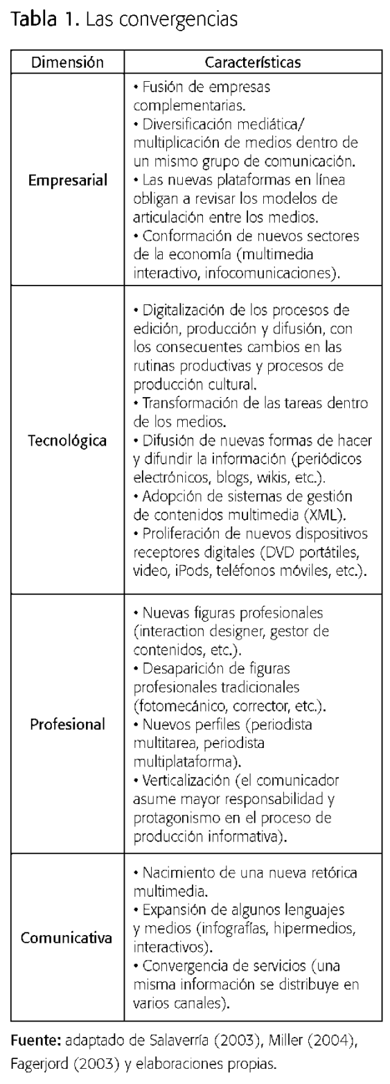 Lo que está pasando en las redacciones de los medios informativos es representativo de las transformaciones que está sufriendo toda la industria cultural. La desaparición de figuras profesionales tradicionales, la aparición de perfiles polivalentes, el desarrollo de nuevas rutinas productivas y la entrada prepotente de las tecnologías dentro de las redacciones son sólo algunos de los elementos que marcan el nuevo paisaje profesional (Scolari et al., 2006 2007). Según Salaverría, el periodista multimedia admite dos interpretaciones: el periodista multiárea y el periodista multiplataforma. El periodista multiárea asume múltiples labores de redacción, fotografía, edición, etc., que antes eran realizadas por distintos profesionales. En el caso de los periodistas multiplataforma, un mismo profesional elabora y difunde sus informaciones a través de múltiples canales; para ello, ajusta sus textos a las características de cada medio. En ambos casos, el trabajo del periodista se vuelve vertical o, lo que es lo mismo, asume mayor responsabilidad y protagonismo en el proceso de producción informativa. En la Tabla 1 se presentan las características principales de las cuatro dimensiones de la convergencia.