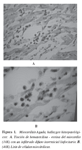 Estudios de miocarditis en modelos murinos han dejado al descubierto mecanismos inmuno-lógicos involucrados en la fisiopatología de la misma. Tal es el caso de Huber et al., (10) quienes describieron citotoxicidad celular mediada por células T, macrófagos y células NK en el miocardio de un ratón infectado por virus Coxsackie B3. La citotoxicidad celular mediada por anticuerpos también puede participar en la destrucción tisular miocárdica. Este modelo mostró que aunque la viremia estaba presente en el día quinto, la destrucción miocárdica fue aparente de dos a tres días después de que los títulos virales declinaban. Un patrón similar de daño miocárdico se ha descrito en otras enfermedades virales, donde una fuerte respuesta inmune es vista en el día quinto del comienzo de la fiebre y coincide con la máxima expresión clínica de la enfermedad debido a daño endotelial, hepático y plaquetario (11). Esta observación se puede aplicar a este paciente quien mostró enzimas hepáticas elevadas, derrame pleural y signos de choque cardiogénico al día quinto de la enfermedad.