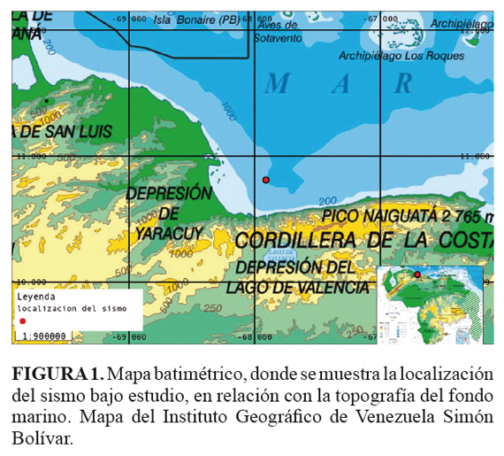 La profundidad focal utilizada para ajustar los sismogramas sintéticos con los observados varía entre 10 y 12 km. Esta variación puede ser debida a la topografía del fondo marino. En la zona donde se localiza el sismo, los espesores de la capa de agua varían entre 1 km y 2 km, de acuerdo con el mapa de batimetría del Instituto Geográfico de Venezuela Simón Bolívar (FIGURA 1).