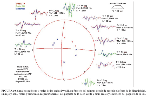 en donde τ está dado en segundos y θ representa el acimut, en grados, medido desde el norte en sentido horario. La dependencia acimutal de la duración de los pulsos de las primeras llegadas de la SH sigue un patrón cosenoidal, lo cual evidencia los efectos de directividad. Por otra parte, τ adquiere su valor máximo para θ=90º, y su valor mínimo para θ=180º. Esto demuestra que el plano de falla tiene orientación este-oeste (plano nodal a) y que la ruptura se propagó en sentido de este a oeste.