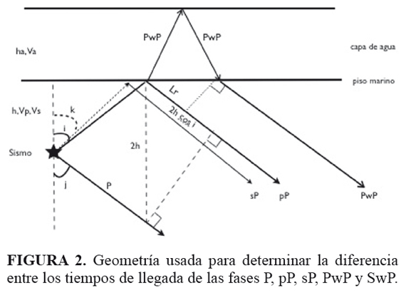 La profundidad focal h, se determinó a partir de la diferencia entre los tiempos de llegada de las fases pP y P en los registros sismográficos de 34 estaciones a distancias epicentrales entre 30 y 90 grados (Mata, 2011), utilizando una velocidad de 6,2 km/seg para la onda P, que corresponde a la primera capa rocosa del modelo de velocidades determinado por Schmitz et al, 2007. La profundidad promedio obtenida es de 12,2 km por debajo de la capa de agua (FIGURA 2).