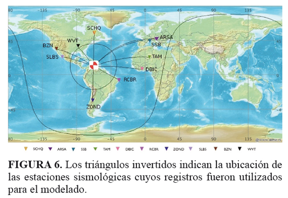 Se modelaron los paquetes de ondas P registradas en seis estaciones banda ancha situadas entre 30º y 78º de distancia epicentral, con acimuts relativamente cercanos a los mínimos de amplitud de la SH. Se incluyeron las fases P, pP, sP, pwP, swP (FIGURA 2), y múltiples de la pwP y de la swP (no mostradas en la FIGURA 2). Adicionalmente, se modelaron las fases SH y sSH registradas en cuatro estaciones banda ancha ubicadas entre 42º y 64º de distancia epicentral, con acimuts cercanos a los planos nodales de la P. El procedimiento seguido para modelar las formas de ondas se describe en Lay and Wallace (1995, en Stein and Wyssesion, 2003) y en Mata (2011). En la FIGURA 6 se muestra la distribución de las estaciones utilizadas en el modelado. Este se llevó a cabo por ensayo y error. El foco se supuso ubicado en una estructura formada por una capa de agua sobre un semiespacio (FIGURA 2). Para la capa de agua se tomó Vp=1,5 km/s y ρ=1000 kg/m3. El espesor de la capa de agua se varió entre 0,8 km y 1,5 km, dependiendo del acimut de la estación sismográfica, para tomar en cuenta la batimetría (FIGURA 1). Para el semiespacio se tomó Vp=6,2 km/seg, Vs=3,56 km/seg y ρ=2750 kg/m3.