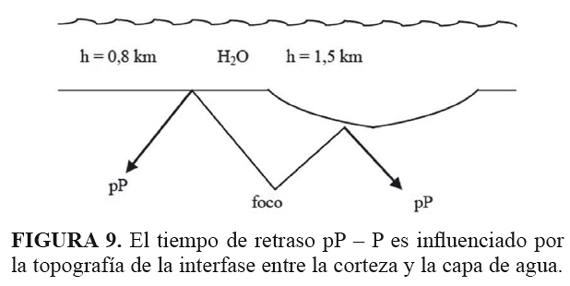 Por ensayo y error se encuentra que las señales de las estaciones orientadas hacia zonas de mayor espesor de agua, se les ajusta mejor las señales sintéticas construidas con la menor profundidad focal. Este es el caso de las señales de las estaciones en acimuts entre 0º y 90º, donde la estimación del espesor de la capa de agua es de 1,5 km, y la profundidad focal asociada es de 10 km. En contraste, para las estaciones orientadas hacia el sureste y noroeste, donde estimamos el espesor de agua en unos 0,80 km, la profundidad focal aumenta a 12 km. En la FIGURA 9 se explica este resultado; nótese que no se muestra el efecto de los sedimentos.