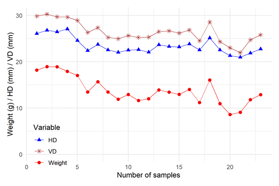 Figure 1 Behavior of the mean values of the weight, horizontal diameter, and vertical diameter of the cherry tomatoes during the harvest period (23 samples).