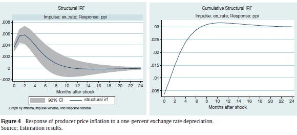 In regard producer prices, our results show a smaller cumulative ERPT elasticity of 0.17. This is basically explained by the fact that the producer price index includes both tradable and nontradable goods. The duration of exchange rate shock effects is also shorter (5 months) on producer prices compared with duration on import prices.