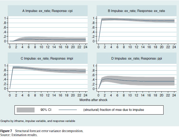 With regard to the variance of producer price inflation (Figure 7D), we may observe that exchange rate depreciation shocks are also important. On impact they account for 38 percent of the variance and the share slightly decreases to 32 percent by the end of the 24-months forecast horizon. The other important source of variation of producer price inflation are the shocks on itself as they explain between 55 and 62 percent (slightly increasing) of the forecast error variance over different forecast horizons (Table A4).