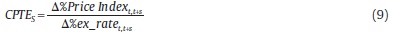 Where Δ%Price Indext,t+s is the cumulative inflation change (in the corresponding prices, i.e. import, producer and consumer) s periods after the shock, and Δ%ex_ratet,t+s is the cumulative exchange rate depreciation change s periods after the shock. In other words, the CPTE at period s is the ratio of the cumulative response of the corresponding price inflation to the cumulative response of the exchange rate depreciation, both evaluated s periods after the exchange rate shock. Because the accumulated inflation response can be interpreted as the percentage change in the corresponding price index (at period t + s) due to a one percent exchange rate depreciation, then the ratio of cumulative responses of price inflation to exchange rate depreciation is an elasticity.