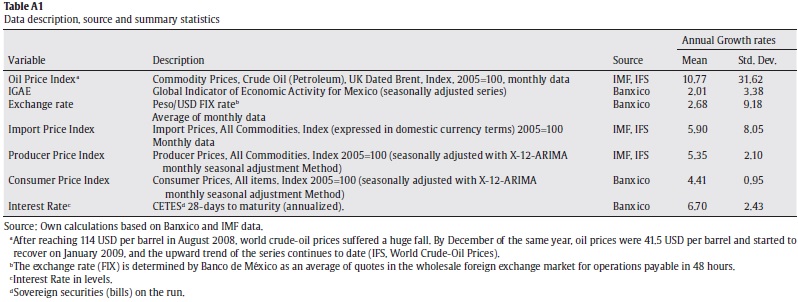 Given that Mexico is an oil exporter country and given the relevance that this commodity price has in the country's supply of foreign currency, our model includes the oil price index as exogenous variable in the system of equations. The recognition of the impact of oil prices on Mexico's exchange rate and on the other variables in the model represents an important contribution to the literature on ERPT for Mexico. And because this study aims at finding evidence on how the exchange rate changes are passed on into prices along the distribution pricing chain, three basic price indexes are taken into account and are the center of the empirical analysis: Import Prices, Producer Prices and Consumer Prices. Additionally, a measure of domestic economic activity is included as well as the interest rate which is the monetary policy instrument. The data sample consists of monthly observations starting from January 2001 as we are interested in analyzing the size and speed of the ERPT once the inflation targeting policy is implemented in Mexico.