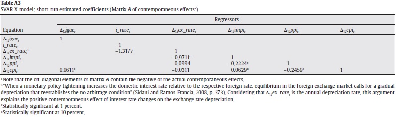 Finding A such that εt has a diagonal covariance matrix Σε is the conventional approach to finding a model with contemporaneously uncorrelated disturbances which focuses in modeling the contemporaneous relations between the observable variables directly. Therefore, if the appropriate choice of A translates into an identified structural form of model (1), the corresponding structural impulse-responses will be unique.17 Normalization restrictions (writing the k-th equation of (1) with ykt as the left-hand side variable) together with a Wold causal ordering (recursive structure), provide the K(K+1)/2 necessary restrictions to uniquely identify the structural shocks and impulse-responses. The recursive structure in our model would imply that the annual growth rate of IGAE (Δ12igaet) may have an instantaneous impact on all other variables in the model, and the interest rate (i_ratet) as monetary policy instrument may also have an instantaneous impact on all other variables except on IGAE, and so on. The variables ordering as presented in expression (3) is chosen following Hahn (2003) and Capistrán et al. (2012). In particular, the annual growth rate of IGAE is ordered in first place in our model (Hahn, 2003; Peersman and Smets, 2001; Capistrán et al., 2012) implying that policy shocks (through interest rates), shocks on the nominal exchange rate and on prices have no contemporaneous impact on the real economic activity. The interest rate is ordered in second place in our system as we expect the monetary policy variable to have a contemporaneous impact on the exchange rate and prices.