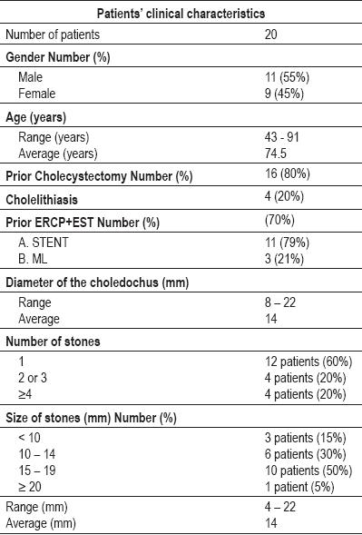 The choledocholithiasis resolution rate was 95% Seventeen patients (85%) required only a single session to solve the condition, while two patients (10%) needed two or more sessions to completely remove the stones, and it was not possible to attempt endoscopic removal of the stones in the choledochus in the case of one patient (5%).