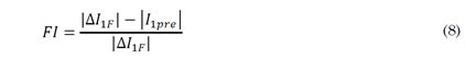 The authors in [18] propose calculating an impact factor (FI) based on the operation of the ADN. The use of the FI is oriented to maintain the fault current magnitude and, consequently, to assure relay coordination. FI is calculated depending on the types of resources connected to the distribution system. In the case of faults where the contribution of only inverter-based DERs is considered, the FI is calculated using (7). ∆I 1F is the superimposed positive-sequence fault current, ∆I 1F is the positive-sequence fault current, and I 1pre is the pre-fault positive-sequence current. Otherwise, the FI is calculated using (8). All currents in (7) and (8) are in p.u.