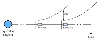 In the system shown in Figure 1, the coordination procedure is frequently initiated at the farthest node from the source. Equation (1) is used to calculate the t L of the relay n-1. Besides, the coordination equation defined by (3) is used to calculate the t R of relay n, where the coordinating time interval (CTI) refers to the time required for the breaker to open the fault and an additional time as a safety criterion.