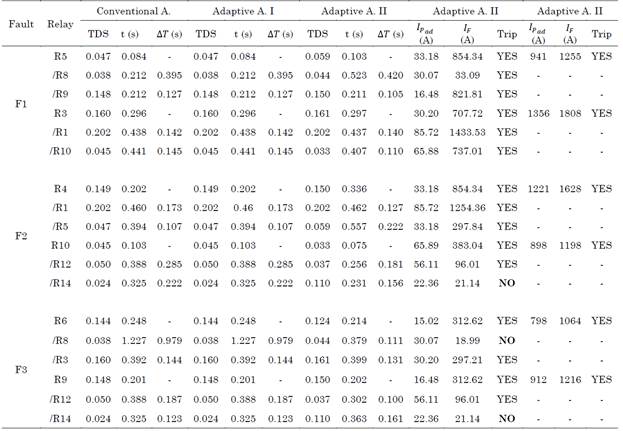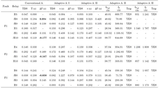 Tables 2, 3, and 4 show the results obtained for each scenario. Three columns of data are shown for the conventional, adaptive approaches I and II. The first one corresponds to the TDS, the second is the relay operation time of each relay (t), and the third is the time difference (∆T) between t R of the backup protection and t L of the primary protection. Besides, the primary relay is represented as R, and the backup relay as /R for each fault. Therefore, ∆T is not calculated for the primary relay, and it is represented using symbol - in the tables.