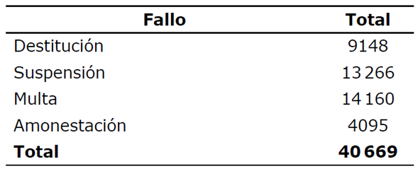 No obstante, según información de la Inspección General de la Policía Nacional (2020), desde el 2010 hasta el 2019, 40669 miembros de la Policía fueron objeto de sanciones de índole disciplinaria distribuidas en 9148 destituciones, 13 266 suspensiones, 14160 multas y 4095 amonestaciones (Tabla 2).