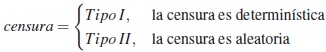 La censura ocurre cuando el tiempo exacto de un evento no ha sido observado para algunos individuos, [4]. Para las observaciones censuradas solo se conoce el límite inferior y el límite superior del tiempo del evento. La manera como se recogen los datos determina las propiedades de los mecanismos de censura, que son: censura tipo I, en la cual los individuos son observados hasta un tiempo determinado, es decir, los individuos son monitoreados por un periodo de tiempo t.
