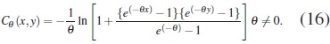Una cópula Arquimediana se define entonces como C(u, v) = ϕ−1 [ϕ(u) −ϕ (v)]. La tabla 2 lista algunas familias importantes de cópulas Arquimedianas con un solo parámetro, que se denotarán por Cθ, [12].