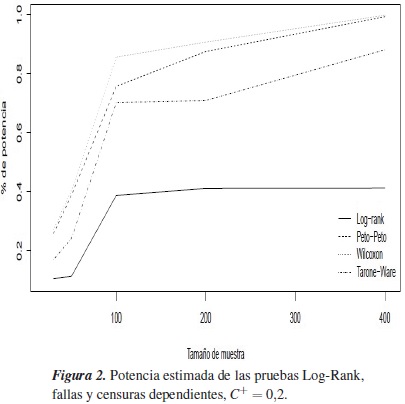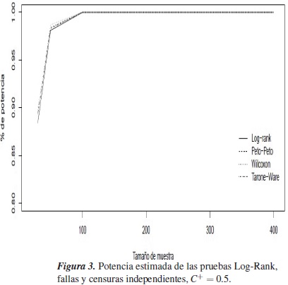 En la figura 1 se muestra la potencia estimada para todas las pruebas cuando las fallas y las censuras son independientes y se tiene porcentaje de censura C+=0,2, en esta se puede observar a partir de un tamaño de muestra de n =100, que la potencia es igual a 100%, para tamaños de muestra de n =30 y n =50, la prueba que mayor potencia tiene es la de Wilcoxon y la que menor potencia tiene es la Log-Rank.