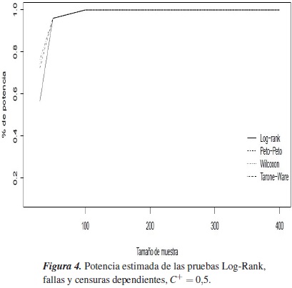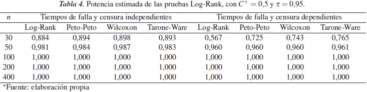En la tabla 4, se muestra la potencia estimada de las pruebas Log-Rank, con porcentaje de censura C+ = 0,5.