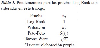 La tabla 1 muestra las respectivas poderaciones de cada una de las pruebas Log-Rank estudiadas.