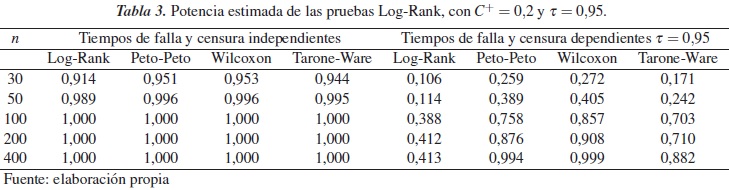 Cuando se tiene porcentaje de censura de C+= 0,2, se evidencia que la potencia de las pruebas Log-Rank para tiempos de falla y censura independientes es superior al 90%, mientras que para tiempos de falla y censura dependientes la potencia está entre 10% y 80%, como se muestra en la tabla 3, para este último caso la prueba que menor potencia presenta es la Log-Rank indistintamente del tamaño de muestra.