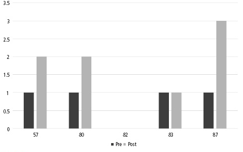 En relación al método propuesto para la intervención, las pruebas clínicas se realizaron antes y después del plan de tratamiento. Los resultados de las pruebas para marcha y para patrones fundamentales de movimiento fueron evaluados de manera directa por una de las fisioterapeutas. De igual forma, otras tres fisioterapeutas revisaron el proceso mediante video para hacer una ponderación de resultados y análisis de la información a través de un consenso entre expertos. Los resultados para la función motora gruesa fueron evaluados usando la GMFM 12 (Tabla 4 y 5 y Figura 2).