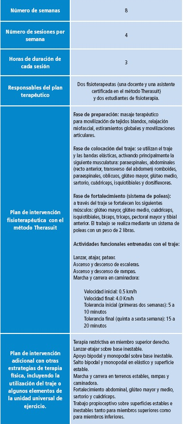 Con el propósito terapéutico de favorecer tanto la independencia y funcionalidad del niño como la prevención, el mantenimiento y la mejoría de alteraciones neuromotoras, se decidió utilizar el método Therasuit 17, descrito como el empleo de una ortesis blanda, constituida por un traje de dos piezas, rodilleras y zapatos, unidas por un sistema de bandas elásticas. Por su complejidad, se emplea solo en centros específicos con un entrenamiento intensivo de tres a cuatro horas diarias, cinco días a la semana y en periodos de tres o cuatro semanas. En el mismo, mediante el sistema de bandas elásticas, el cuerpo del paciente es alineado tan normal como sea posible. Esta alineación postural, y la función apropiada de los músculos posturales, permite a los pacientes aprender (o reaprender) patrones adecuados de movimiento, lo que hacer que el cuerpo del paciente reciba una presión específica que estimula la propiocepción, el sistema táctil y el vestibular. También se le proporciona estabilización externa al tronco, lo que le permite mayor fluidez y coordinación de los movimientos tanto para extremidades superiores como inferiores.