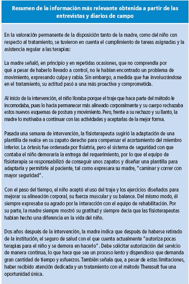 Por su parte, entre las proposiciones en relación al paciente, las cuales se obtuvieron a partir del fenómeno de estudio o expresiones que daban respuesta a las preguntas formuladas, se encentran las siguientes: "El niño no ha tenido estimulación suficiente", "El niño no ha contado con un adecuado abordaje en cuanto a su valoración motora", "Explicar las deficiencias motoras del niño permitirá que sea adecuadamente tratado y que su condición de vida mejore", "El tratamiento fisioterapéutico podría ofrecer al niño y a la madre una mejor condición de vida", "El niño y su madre tienen posibilidades especiales al ser formalmente vinculados al centro de rehabilitación en donde ella trabaja", "En el contexto de un centro altamente especializado en rehabilitación el tratamiento Therasuit es una alternativa terapéutica para el niño".