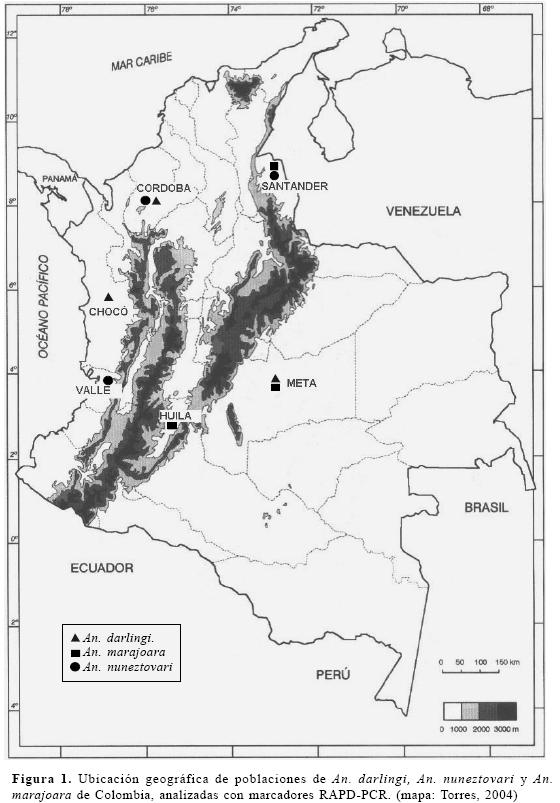 Colección de mosquitos. Para cada especie se seleccionaron mosquitos de zonas geográficas de Colombia donde se constituyen vectores primarios de malaria, considerando en este estudio como poblaciones, las localidades donde se efectuaron las colectas. Para An. darlingi, el municipio de Tierralta (8010´N, 76004´W), Departamento de Córdoba; el municipio de Granada (3032´N, 73043´ W), Departamento del Meta y el municipio de Medio Atrato (5041´N, 76040´W), en el Departamento del Chocó. Los especimenes de An. nuneztovari se colectaron en el municipio de Tierralta; en el municipio de Tibú (8039´N, 72059´W) en Norte de Santander y el municipio de Buenaventura (3054´N, 77005´W) en el Departamento del Valle. Para An. mara-joara el municipio de Cúcuta (7054´N, 72030´W) en el Departamento de Norte de Santander; los municipios Fuente de Oro (3028N, 73038´W) y San Carlos de Guaroa (3043N, 73015´W) en el Departamento del Meta, y el municipio de Yaguará (2040N, 75031´W) en el Departamento del Huila (Fig. 1).