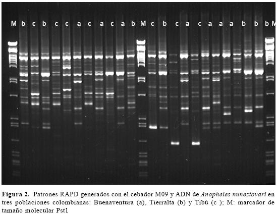 Selección de oligonucleótidos polimór-ficos. Se utilizaron cebadores de Operon, Technologies®, (Alameda California). La selección de los oligonucleótidos poli-mórficos se hizo a partir de 70 y 540 cebadores para An. darlingi y An. nunez-tovari, respectivamente. Para An. mara-joara se utilizaron los cuatro cebadores que produjeron marcadores diagnósticos para la especie C del complejo An. albitarsis s.l. (Wilkerson 1995). Para descartar artefactos de la técnica y verificar la producción de un proceso de amplificación confiable, se emplearon controles negativos (muestra sin ADN) y positivos (la misma muestra de ADN en todos los geles), para cada población y especie. Seis oligonucleótidos fueron seleccionados para evaluar 64 individuos de An. darlingi (14 de Tierralta, 24 de Medio Atrato y 26 de Granada); diez cebadores fueron empleados para evaluar 119 individuos de An. nuneztovari (42 de Buenaventura, 39 de Tierralta y 38 de Tibú). (Posso et al. 2003). Para An. marajoara se evaluaron 99 individuos (45 de Cúcuta, 42 de Fuente de Oro y San Carlos de Guaroa y 12 de Yaguará).