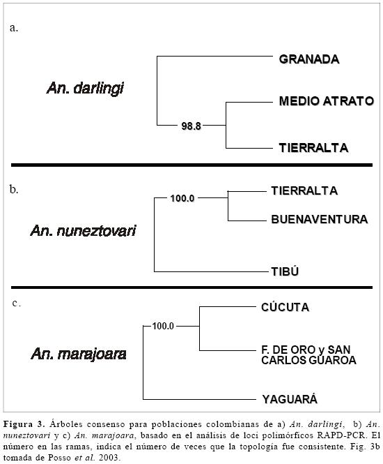 Análisis genético. A pesar de la conespecifidad observada, al computar las distancias genéticas de Nei entre las poblaciones (análisis con el programa RAPDDIST), la frecuencia de alelos de las poblaciones de cada una de las especies, analizadas por separado, fue consistentemente diferente para un gran número de loci ya que el boostrap que soporta las ramas derivadas fue mayor que el 90% (Fig. 3), es decir que a pesar de no ser especies claramente estructuradas, existe una diferenciación genética, explicada por un gradiente de separación geográfica. En An. darlingi y An. nunez-tovari, el árbol consenso estricto determinó un mayor parecido (genético) entre las dos poblaciones del Occidente, mientras que en An. marajoara la rama derivada relacionó a las poblaciones del oriente (Figs. 3a y 3b). En An darlingi, Medio Atrato (Chocó) y Tierralta (Córdoba) conformaron un agrupamiento significativamente separado de Granada (Meta) (Fig. 3a). Para An. nuneztovari la mayor relación genética se observó entre las poblaciones de Buenaventura (Valle) y Tierralta, claramente diferenciada de Tibú (N. De Santander) (Fig. 3b). Para An. marajoara la rama derivada agrupó a las poblaciones de Cúcuta y Meta, diferenciada significativamente de la población de Yaguara (Huila), (Fig. 3c). Los análisis genéticos siguientes soportan estas observaciones.