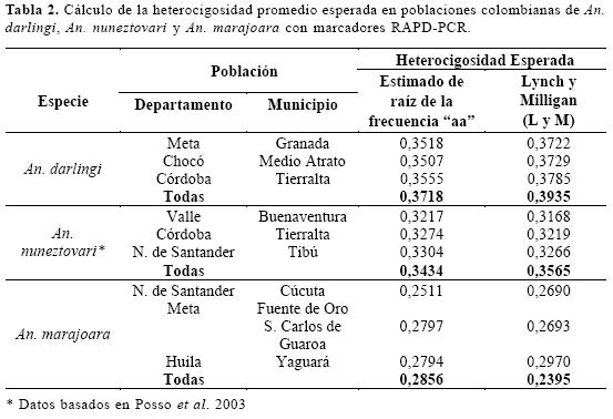 Los valores de heterocigosidad obtenidos con el método de Lynch y Milligan Tabla 2, indicaron también la existencia de poblaciones heterogéneas de An. darlingi y An. nuneztovari con un alto nivel de polimorfismo. Aunque para An. marajoara se obtuvo un menor valor (0,2936) estos niveles de polimorfismo, indican que existe un flujo genético dentro y entre las poblaciones, el cual permite la expresión de un rango de caracteres y comportamientos que aunque variables, confirman características que definen la especie de cada uno de estos vectores.