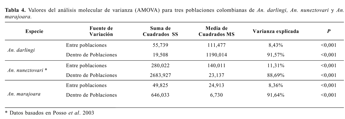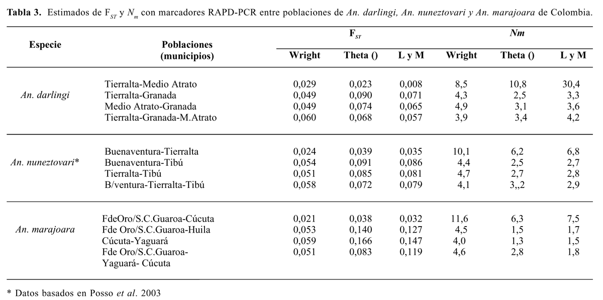 En general, para cada uno de estas tres especies vectoras de malaria en Colombia se registraron diferencias intrapoblacio-nales que podrían indicar apareamientos al azar, con un flujo de genes suficiente para mantener un bajo grado de estructuración genética, el cual puede depender del grado de separación geográfica entre las poblaciones de cada especie.