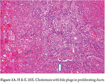 - Intracanalicular cholestasis with bile plugs within bile ducts and canaliculi (Figures 2 A and B)