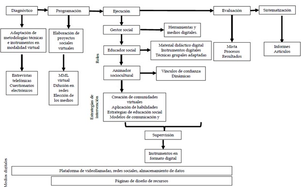Durante la etapa de intervención, que consiste en la aplicación de un proyecto de intervención, se desarrollan tres funciones principales: gestor social en el uso de herramientas y medios digitales; educador social en la aplicación de materiales didácticos e instrumentos digitales y técnicas grupales adaptadas; y animador sociocultural mediante los vínculos de confianza y dinámicas participativas. De igual modo, es imprescindible generar diversas estrategias de intervención como las comunidades virtuales, aplicación de habilidades, estrategias de educación social, modelos de comunicación y aprendizajes adaptados a la modalidad virtual.