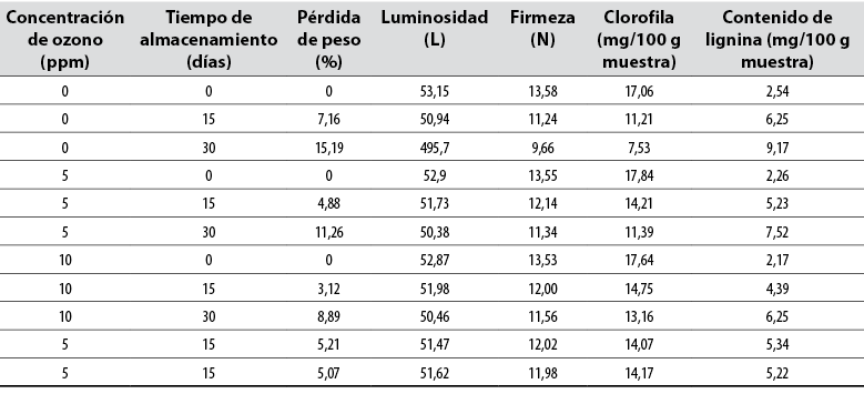 En la tabla 2 se presentan los resultados obtenidos en las características fisicoquímicas luego de aplicar un diseño compuesto central rotable de la metodología de superficie de respuesta, lo cual permitió modelar el comportamiento de estas variables dependientes en función de la concentración de ozono gaseoso y tiempo de almacenamiento.