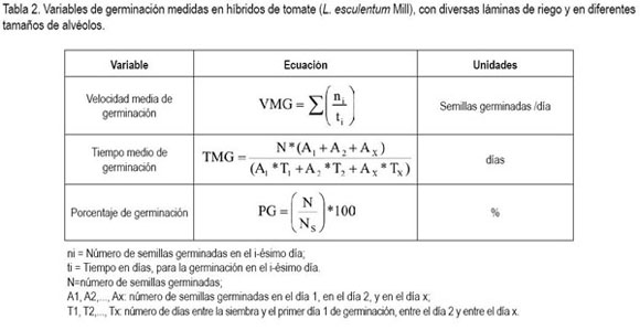 Water management is very important in the tomato culture, the success or failure of the crop depends on it. Unknown facts, under our conditions, are the amount of water required by the plant during germination and subsequent propagation, as well as the optimal tray alveolus size for a better future yield. The effect of the alveolus size and of different water tables in four tomato long life hybrids, planted in peat as substrate was evaluated. A statistical design of random blocks with four repetitions was employed being the variables alveolus sizes and 16 treatments that combined water tables or coefficients of irrigation (1.0; 1.4; 1.8; 2.2) and hybrids (Sheila, Astona, Indaba, Daniela 593) for a total of 64 experimental units (UE). The results showed that the best coefficient (water table) for the tomato seed germination was the 2.2. The optimal tray sizes encountered were those having 72 and 144 alveoli. The best performance was obtained with the hybrid Daniela 593 with water coefficients of 2.2; 1.8 or 1.4, planted in trays of 72 alveoli. This hybrid presented a high rooting percentage and an increased response of production of fresh and dry mass. Appropriate moisture content, guaranteed by the water table applied and the alveolus size, optimized the medium germination time (MGT) and the medium germination velocity (MGV). The highest germination percentage was obtained with the hybrid Sheila.