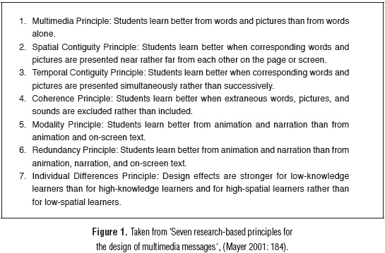 A somewhat different set of principles is presented in Mayer (2005b) where a personalization principle is introduced that claims that there is deeper learning when words are presented in conversational style rather than formal style. Mayer (2005 b) also adds two more principles: an interactivity principle, deeper learning occurs when learners are allowed to control the presentation rate than when they are not; and a signalling principle: deeper learning takes place when key steps in the narration are signaled rather than nonsignaled. Designers of TEFL materials should, then, pay attention to these principles when elaborating multimodal texts.
