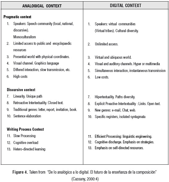 We think that writing hypertexts and hyperstories, which are only two of the multiple possibilities that cyberspace has, will contribute to improve the writing process of our students. It is now our responsibility as teachers to evaluate and research the effects of the new digital technologies on the processes of text comprehension and language production. The effects of the digital change on writing is well summarized by Cassany (2000:4) in the following chart: