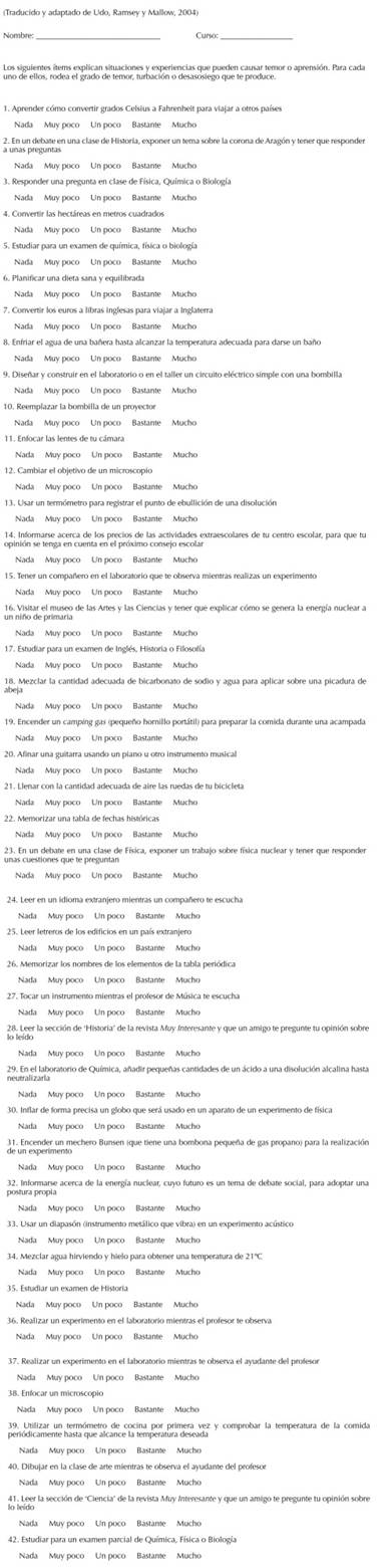 En primer lugar, para medir la ansiedad científica se ha usado un cuestionario validado y ampliamente utilizado en diversas investigaciones (Udo et al., 2004). En realidad, este cuestionario registra la ansiedad tanto en contextos científicos como en contextos no científicos. En el anexo 1 puede verse la versión castellana y adaptada de dicho instrumento. Se compone de 44 ítems que exponen diferentes situaciones y experiencias que pueden causar temor o angustia. La mitad de estas situaciones se desarrollan en un contexto científico, mientras que la otra mitad no. Además, los ítems se encuentran emparejados y exponen situaciones análogas que en un caso se contextualizan en el ámbito científico y en el otro en un contexto cotidiano.