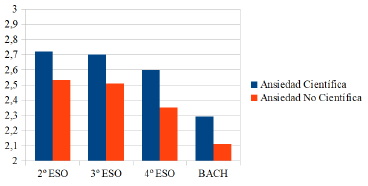 Como puede verse en la figura 1, el nivel de ansiedad es medio-bajo (entre 2 y 3, en un a escala de 1 a 5) y más alto siempre en el caso de la ansiedad cientifica. Este resultado es coherente con el obtenido por Quintero et al. (2009). Además, se hace sentir el efecto del nivel académico claramente a partir de 4º de la ESO. Debe tenerse en cuenta que en nuestra muestra de estudiantes un mayor nivel académico lleva asociado haber cursado más asignaturas científicas, esto es, mayores conocimientos científicos. Por otro lado, el Anova efectuado ha mostrado que el nivel de ansiedad en contextos científicos es significativamente superior que ante contextos no científicos, lo que nos permite confirmar la primera hipótesis planteada.