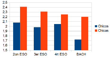 En la figura 2 aparecen las puntuaciones medias de ansiedad científica según el género y el nivel académico de los estudiantes. En la figura 3 se representan las puntuaciones medias de la ansiedad generada en chicos y chicas por la prueba de evaluación de competencias científicas en los distintos niveles académicos.