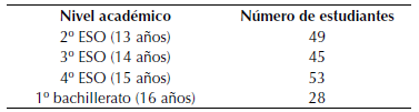 En el estudio han participado 175 estudiantes (89 chicas y 86 chicos) de un centro educativo público de educación secundaria del País Valenciano (España), de los cuales 147 son de educación secundaria obligatoria (ESO)1, y 28 son de bachillerato científico-tecnológico2 (. Se trata de una muestra de conveniencia y, consecuentemente, los resultados y las conclusiones que se obtengan solo pueden ser válidas stricto sensu para los sujetos que han intervenido en el estudio.
