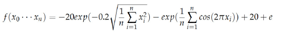 La función Ackley se caracteriza por tener un espacio bidimensional, con mínimos locales y un mínimo global en f(0, ..., 0) = 0. Fue propuesta por Ackley (1987) y está definida por:
