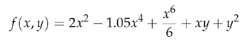 La función Camel es un espacio bidimensional, tiene seis mínimos locales, dos de los cuales son globales. Esta función se define como: